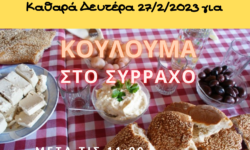 Την Καθαρά Δευτέρα 27 Φεβρουαρίου 2023, μετά από τρία χρόνια λόγω covid19, γιορτάσαμε επιτέλους όλοι μαζί ξένοιαστα τα κούλουμα, απολαμβάνοντας τη φασολάδα, τη λαγάνα και τα υπόλοιπα σαρακοστιανά μαζί με το κρασάκι μας και τα τσιπουράκια μας, με έξοδα του Συλλόγου, γιατί μας αξίζει. Το Σύρραχο με την Όλγα…